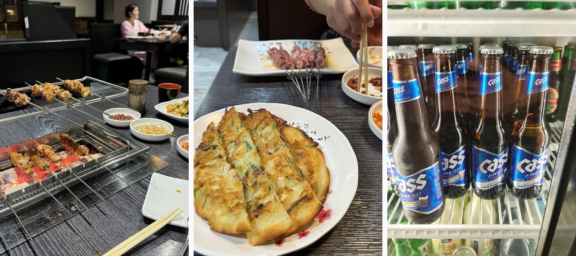 It was pretty popular long before this type of restaurant (Chinese lamb grill) in Korea. And we found this restaurant in New Malden from my Korean friend. The price was reasonable, and the food was excellent. I recommend you go there during winter because you will be in front of the fire the whole time you eat. The meats were fresh and tender, and you could choose between lamb, beef and chicken. I wouldn't say I liked the chicken gizzard and liver. In fact, I don't prefer those parts. We also tried grill menus such as bread, cheese stick, and fish cake. My favourite is fish cake and bread cum condensed milk. It was quite an exciting experience. In addition, we ordered peach soju - Korean fruit flavoured - which has some sweetness in the alcohol. It is generally consumed by women who don't like alcohol a lot. Kimchi, peanut and mung bean sprouts were complimentary.